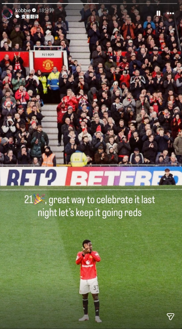 梅努在个人社媒晒出自己在球场的照片,配文写道:“昨晚以一种很棒的方式庆祝自己21岁生日,让我们保持这样的势头!”